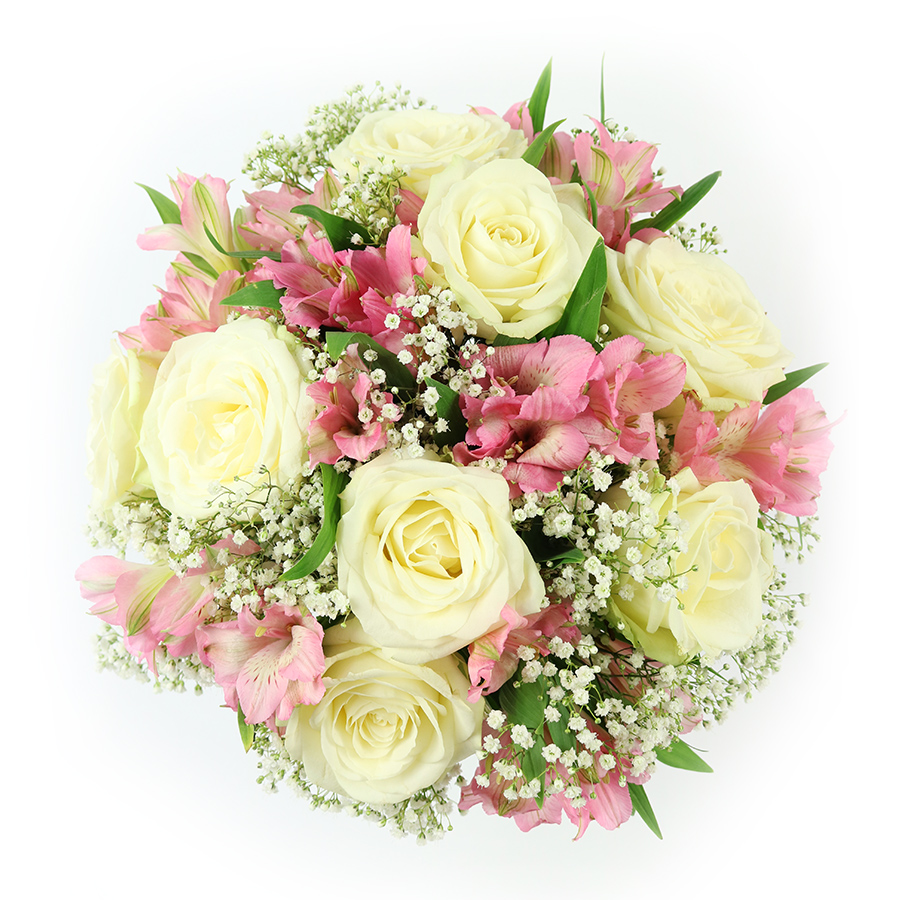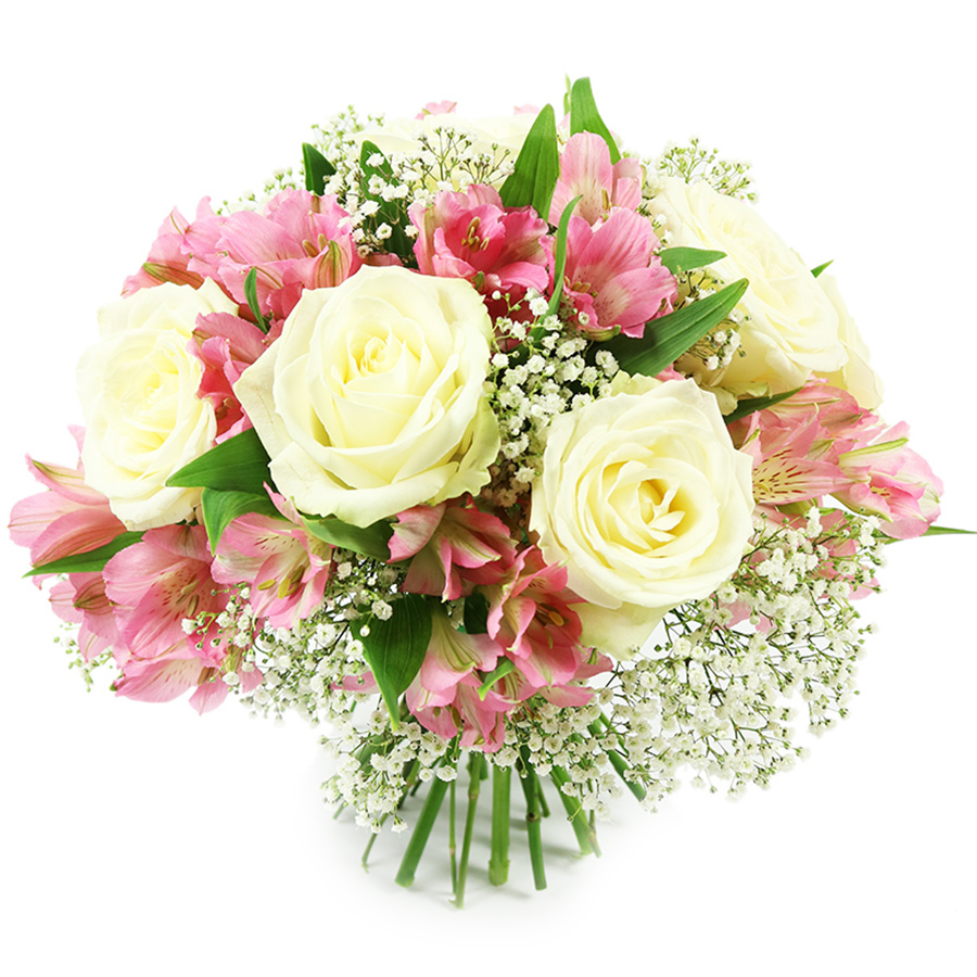 Celebrate life's moments with our sophisticated and unique hand-tied bouquet, featuring pristine white roses, delicate pink alstroemeria, soft gypsophila, and vibrant greenery. This elegant arrangement is ideal for any occasion, exuding both beauty and refinement.